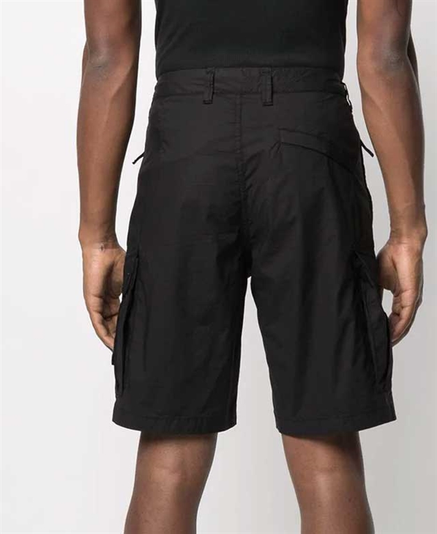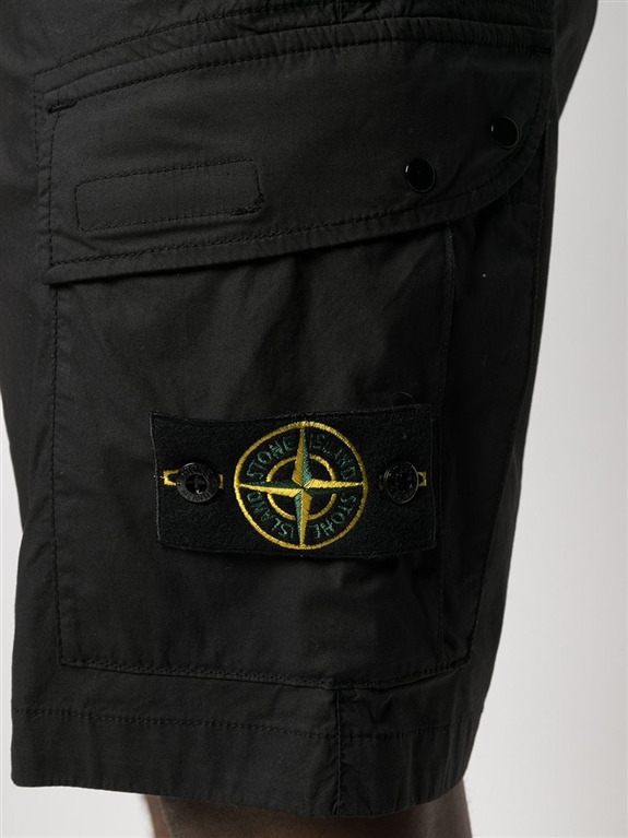 Bermuda cargo in leggera tela di cotone stretch. Tinto in capo. Regular fit. Tasche a filo chiuse da zip nascosta. Sul retro, una tasca leggermente obliqua chiusa da automatici nascosti. Tasche a soffietto sulle gambe, con patella chiusa da velcro; la tasca sinistra ospita il badge Stone Island. Chiuso da zip e bottone.