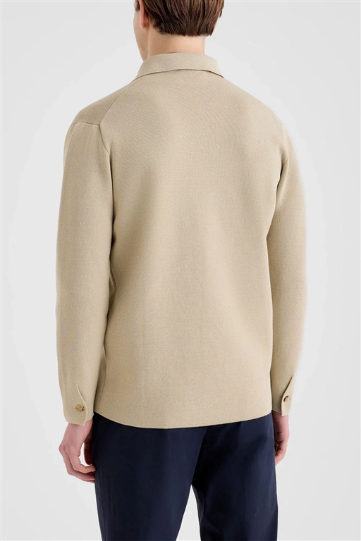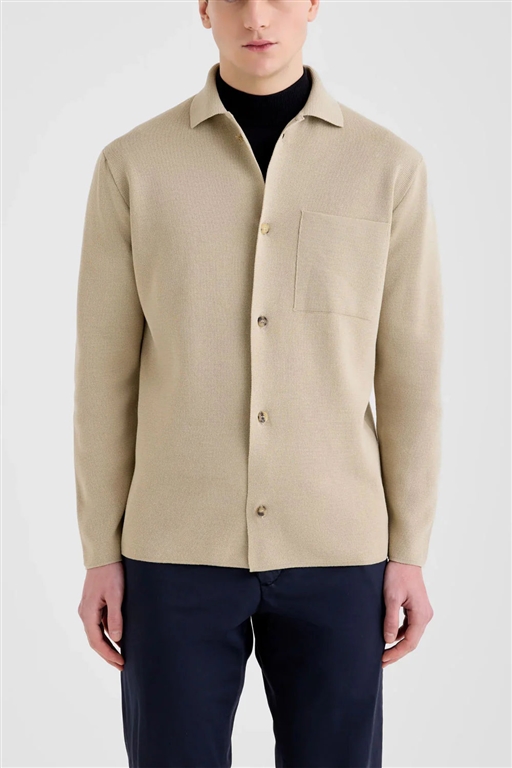 Camicia over in cotone crepe lavorazione punto milano colore beige. Colletto a vela e chiusura frontale con bottoni. Taschino applicato sul petto