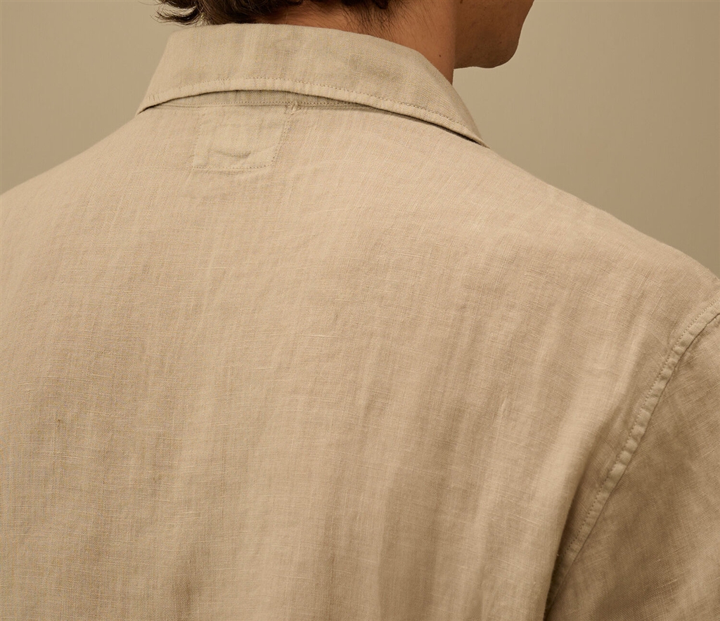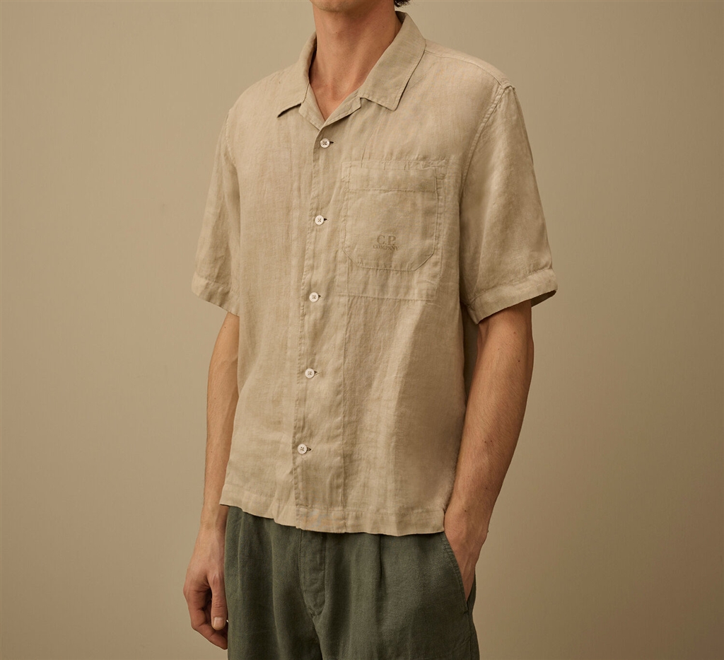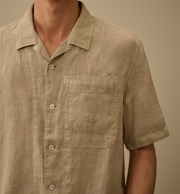 Camicia a maniche corte realizzata in lino,un tessuto leggero e traspirante. Il modello presenta un colletto classico, una chiusura frontale con bottoni e una tasca aperta sul petto con logo stampato. La camicia è tinta in capo per ottenere intensità cromatiche uniche che si esaltano con il tempo e lutilizzo. Made in Italy. Boxy fit.
