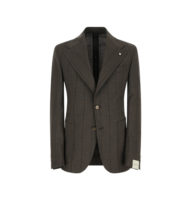 Questo raffinato completo da uomo, composto da giacca e pantalone, è realizzato in un tessuto pregiato e leggero, ideale per un look sartoriale formale e di distinzione. Il completo presenta un sofisticato motivo gessato (chalk stripe) nei toni del marrone su un fondo di una tonalità profonda e neutra, che conferisce slancio e verticalità alla figura. Il design della giacca monopetto a due bottoni è definito da revers a lancia e dettagli curati che ne esaltano la fattura artigianale: Doppia tasca a toppa applicata sui fianchi e taschino a barchetta sul petto. Struttura sfoderata per una leggerezza ideale, mantenendo una vestibilità sartoriale asciutta. Pin decorativo al revers e asole aperte ai polsi. Il pantalone coordinato presenta una linea moderna, con pieghe e vita regolare, perfettamente in linea con lo stile della giacca. Questo completo rappresenta una fusione perfetta di tradizione sartoriale e comfort contemporaneo.