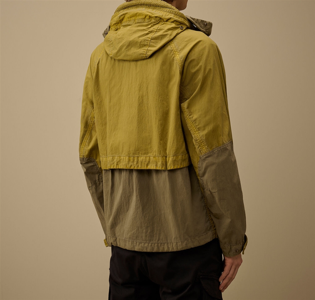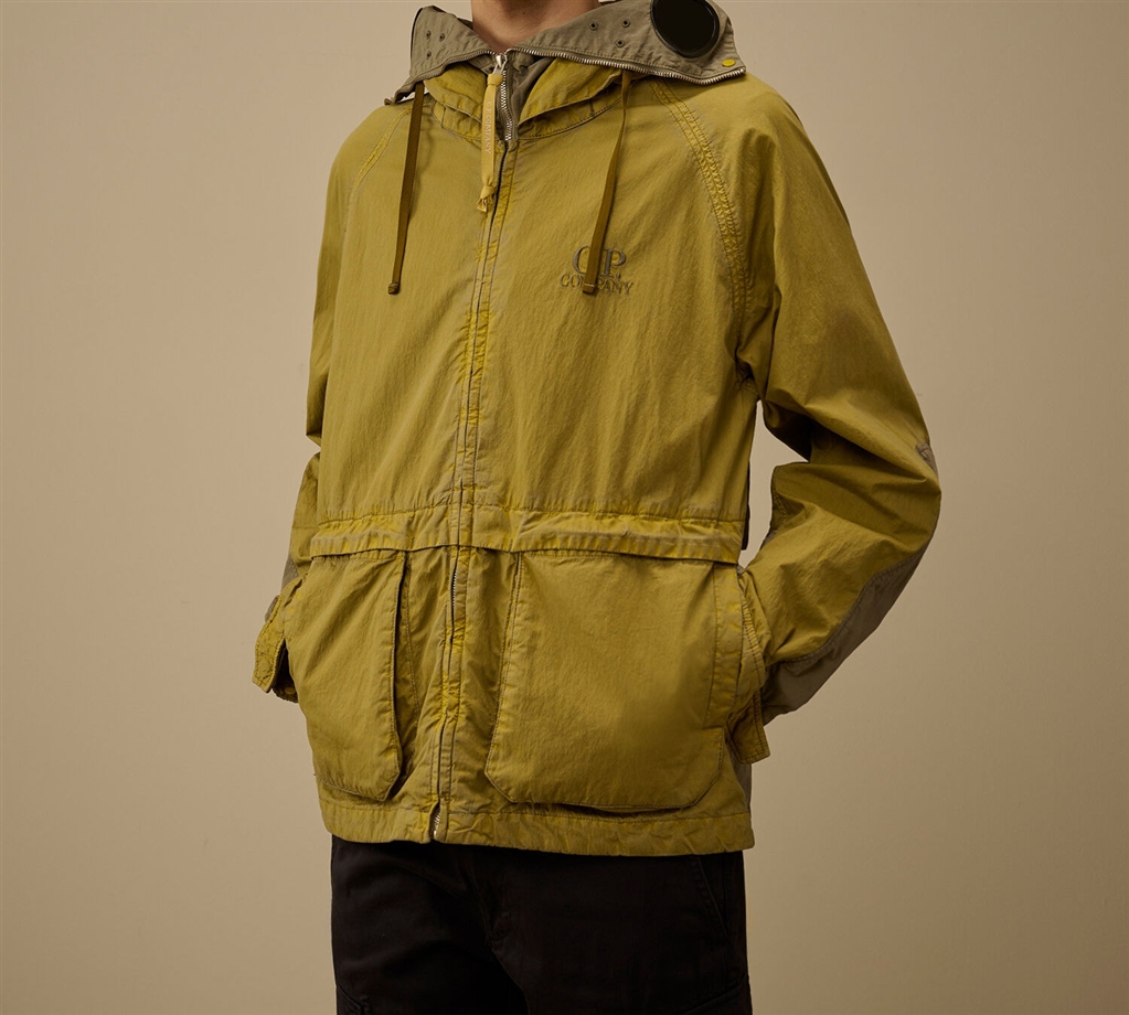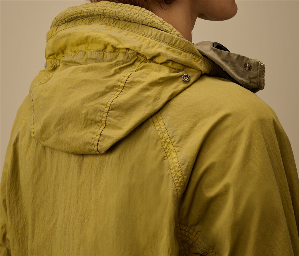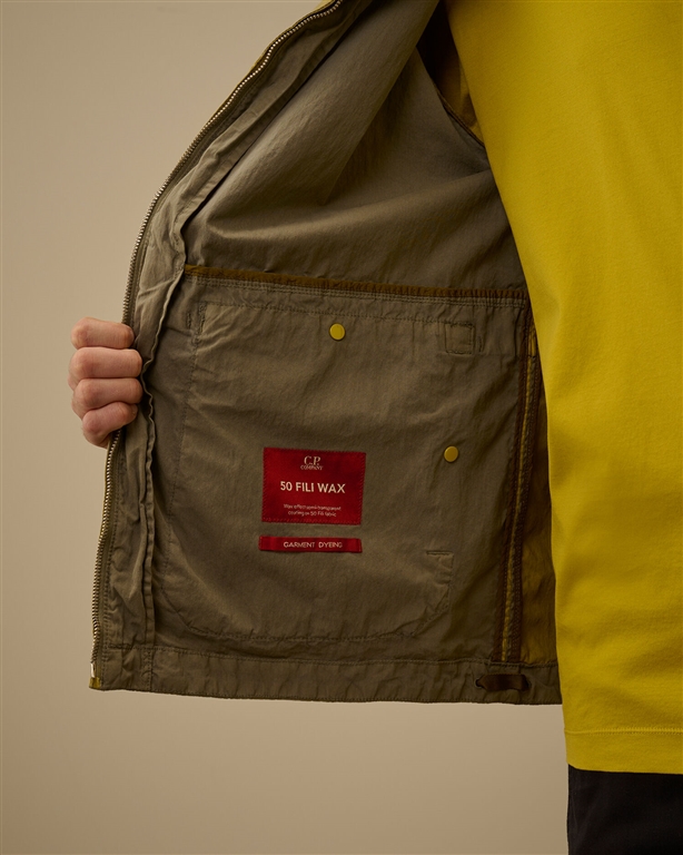 Explorer jacket realizzata in 50 Fili Wax, liconico tessuto in nylon e cotone di C.P. Company, qui presentato in una versione con rivestimento esterno semitrasparente a effetto cera sintetica idrorepellente. Il rivestimento poliuretanico applicato alla superficie esterna migliora notevolmente la resistenza agli agenti atmosferici.Il modello presenta il cappuccio Explorer regolabile, chiusura full zip, e logo ricamato sul petto. Dotata di tasche frontali nascoste con patta e bottoni automatici, orlo regolabile con coulisse e fodera in mesh per maggiore traspirabilità. Il pannello di ventilazione posteriore e i dettagli a contrasto sul retro completano il design funzionale e tecnico del capo. La giacca è tinta in capo con doppia tintura, in cui nylon e cotone vengono tinti in colori differenti per creare sfumature di tono e profondità cromatica uniche. Completato da trattamento anti-goccia. Regular fit.