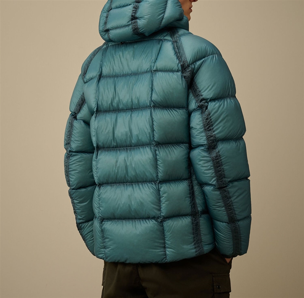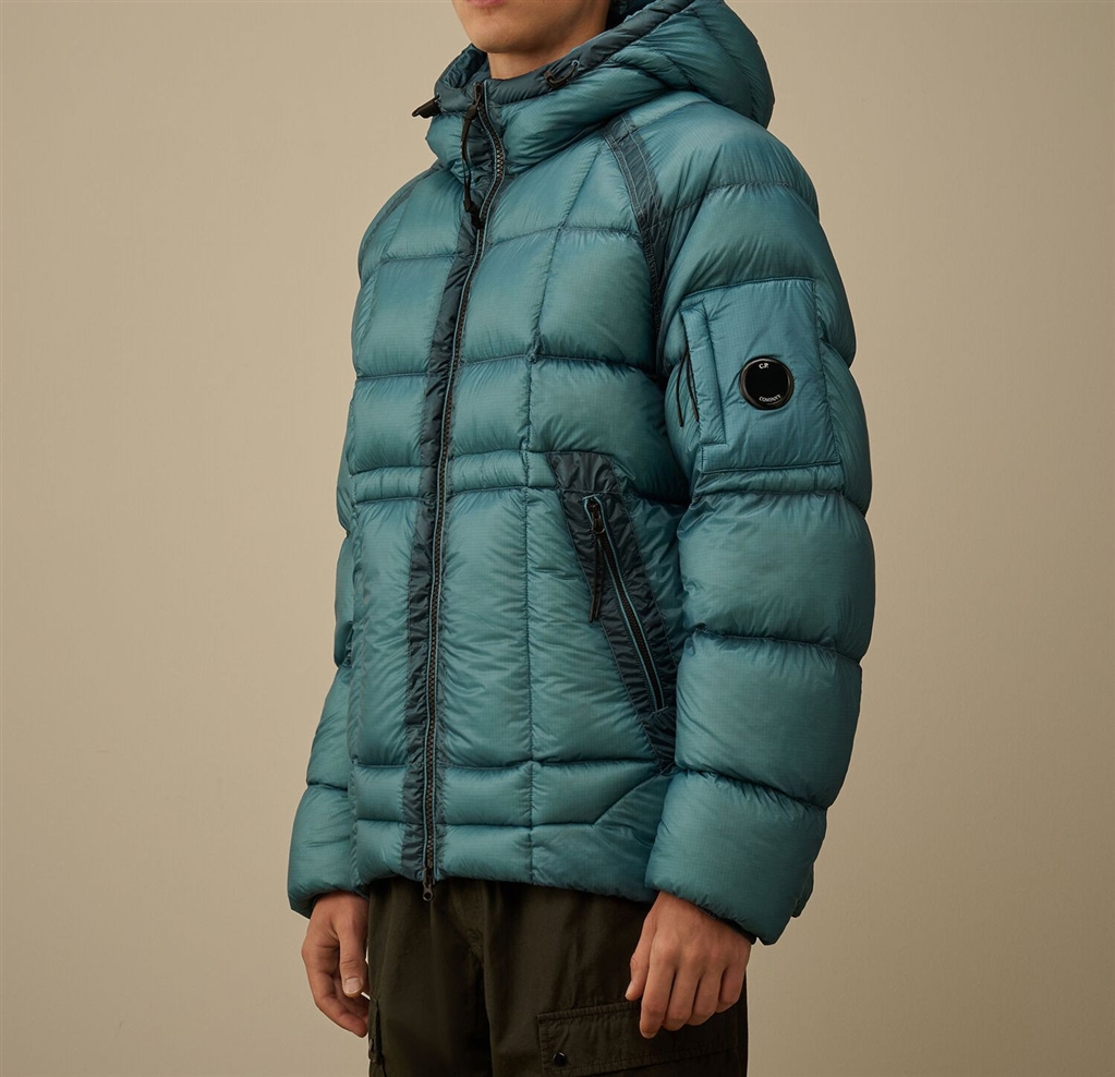 Piumino con cappuccio realizzato in D.D. Shell, un nylon micro-ripstop opaco 7 denari. La leggerezza e la trasparenza del materiale mette in risalto la costruzione, mentre il processo di iniezione a piuma diretta assicura un isolamento ideale. Il modello presenta cappuccio regolabile, chiusura full zip a doppio cursore, tasche laterali con zip, cuciture a contrasto, polsini elasticizzati, fondo regolabile con coulisse e l’iconica Lente di C.P. Company. Regular fit.