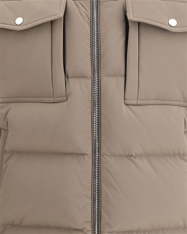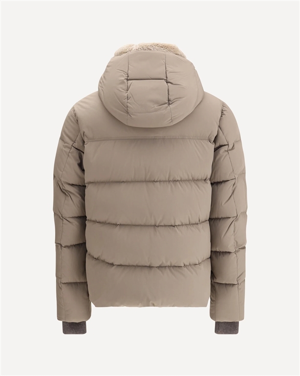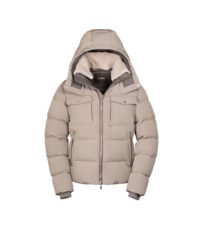 Il piumino imbottito Alarick di Moorer unisce calore e stile raffinato. Caratterizzato da collo alto e cappuccio rimovibile, presenta un lussuoso colletto impreziosito da pelliccia di shearling. Le tasche sul petto con patta e bottone aggiungono praticità, mentre i polsini elasticizzati a costine e l'orlo dritto completano il design, garantendo comfort e una vestibilità perfetta.