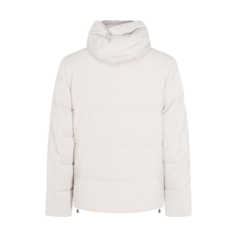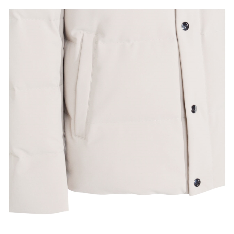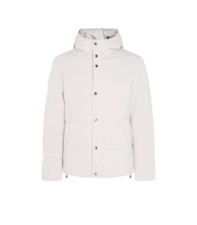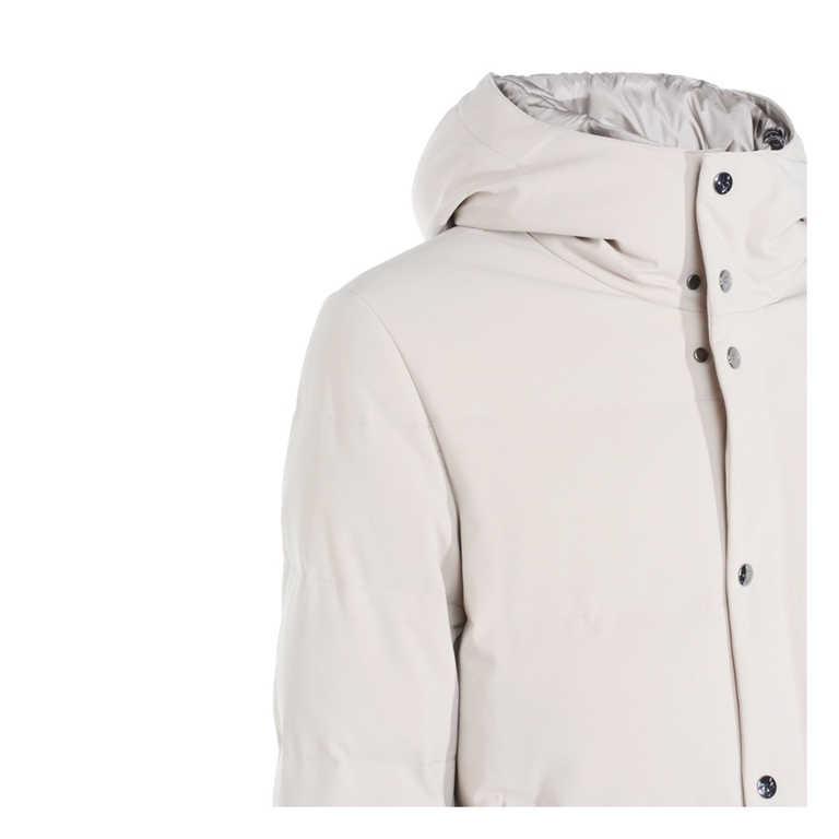 Piumino avorio di Montecore con collo alto, cappuccio, maniche lunghe, imbottitura, chiusura frontale, tasche e vestibilità regolare.