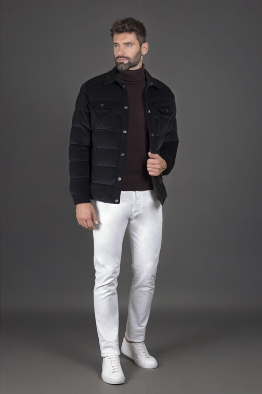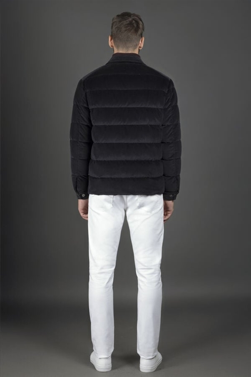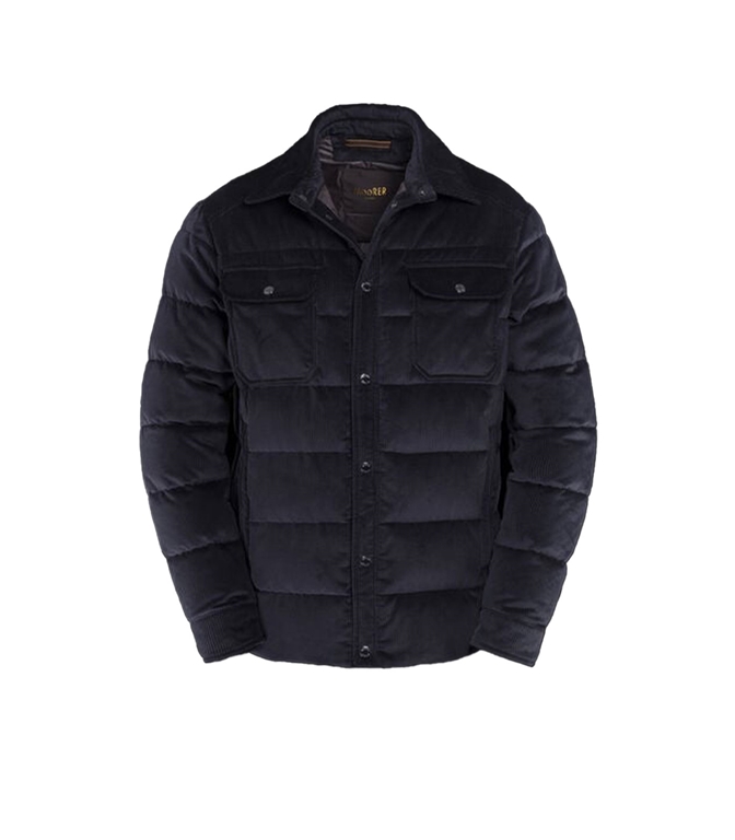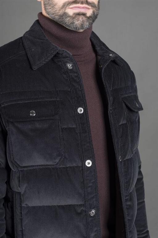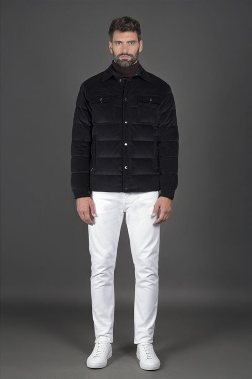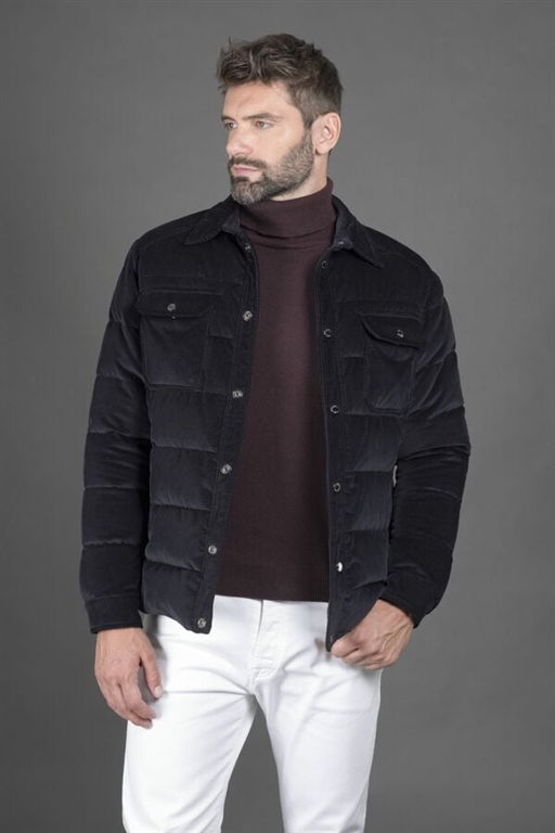 Moderna overshirt trapuntata a boudin e imbottita in piuma d'oca. Realizzata in velluto di cotone, dalla mano morbida e dall'aspetto lucente.