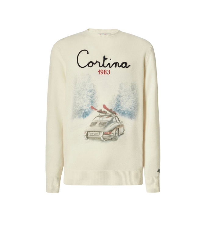 Maglione stampato7ggLavorazione a maglia rasataMisto cashmereGirocolloManiche lunghePolsi, fondo e bordo collo a coste singole 1x1Tinta unita biancoStampa piazzata Cortina roadRicamo Cortina 1983Vestibilità regolareComposizione: 10% cashmere 40% lana 25% viscosa 25% nylon