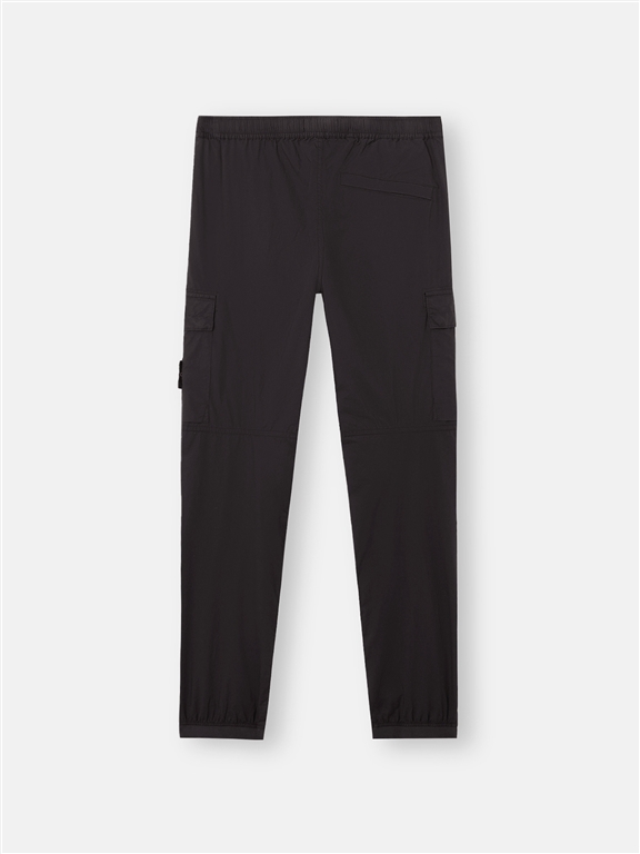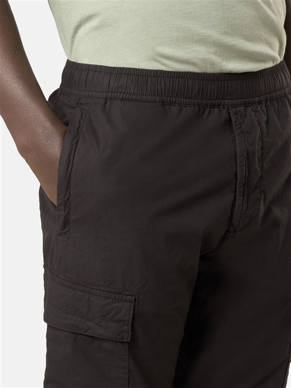 Pantalone cargo in leggera tela di cotone stretch con tasche con zip e bottoni automatici, fondo gamba con fettuccia elasticizzata e vita elasticizzata con coulisse. Tinto in capo.Pantalone cargo in leggera tela di cotone stretch. Tinto in capo.