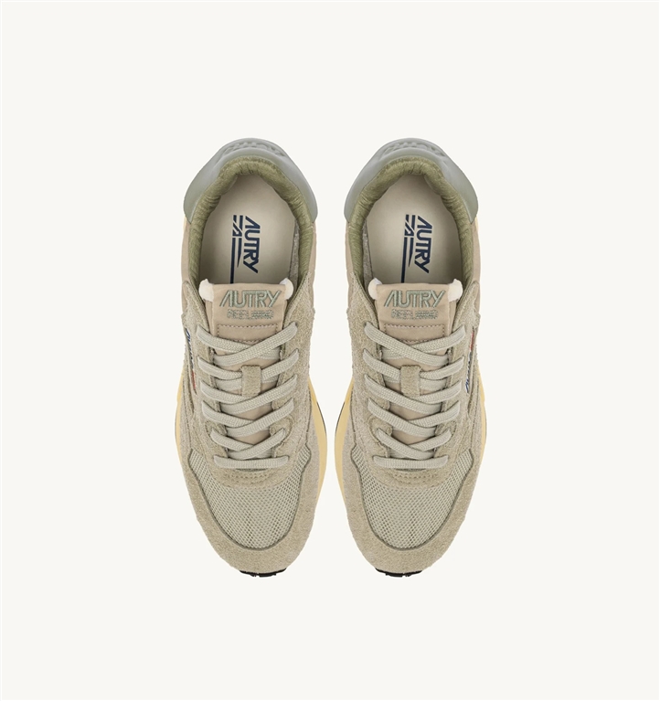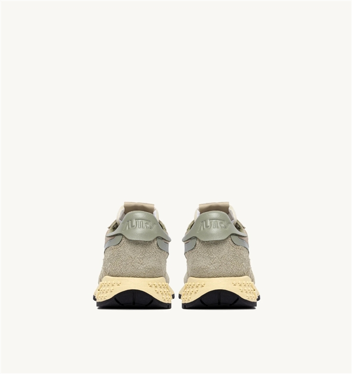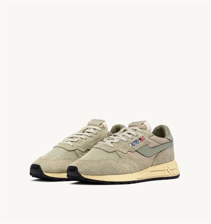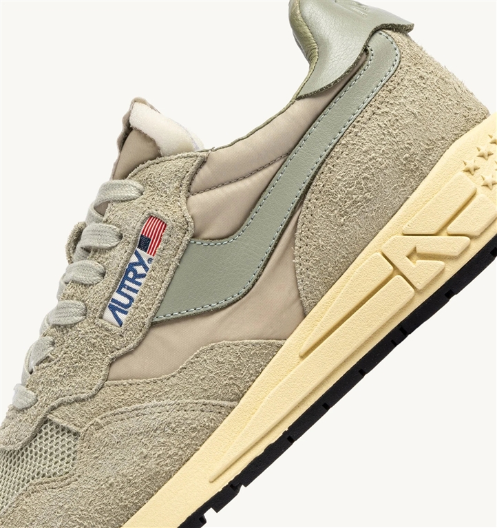 Le sneakers Reelwind combinano il caratteristico stile di Autry con elementi ispirati al mondo del running. Definite da una silhouette slanciata e un design rétro anni 80, offrono leggerezza, flessibilità e grip ottimale.Questa variante crea originali combinazioni color-block, un twist di carattere per ogni look. Il modello da uomo è realizzato in un mix di nylon beige e suede verde chiaro con l'applicazione sui lati in pelle verde.Progettata per un lifestyle dinamico, si caratterizza per la costruzione performance che offre massima libertà di movimento. La suola in gomma con battistrada a rilievo è personalizzata con il motivo a stelle e la A-arrow che reinterpreta il logo in chiave grafica e moderna.
