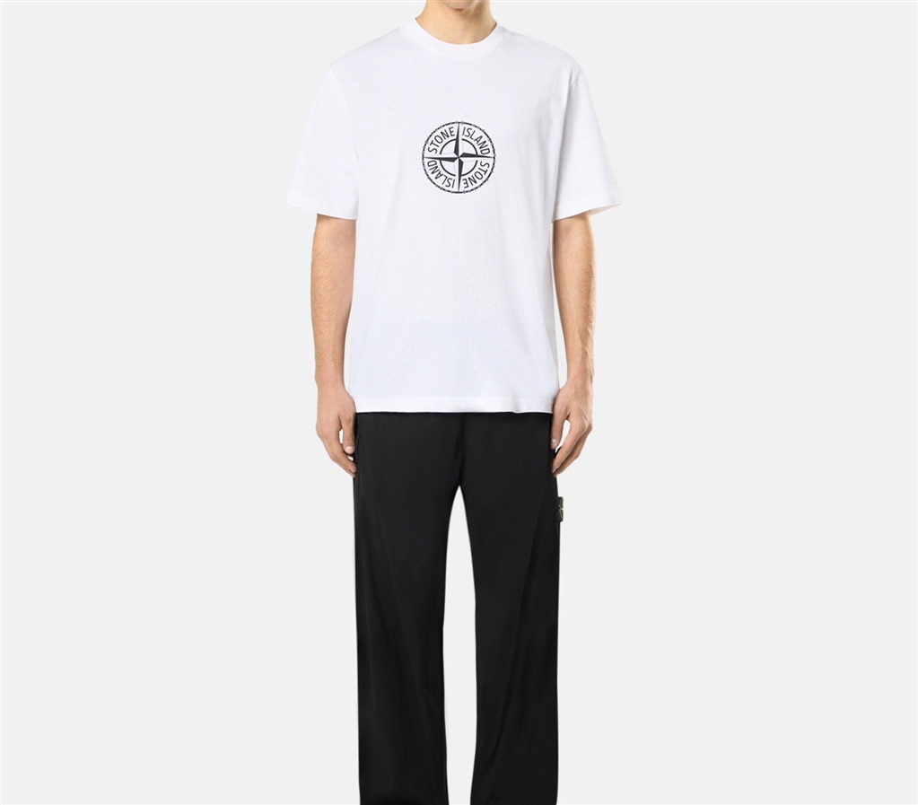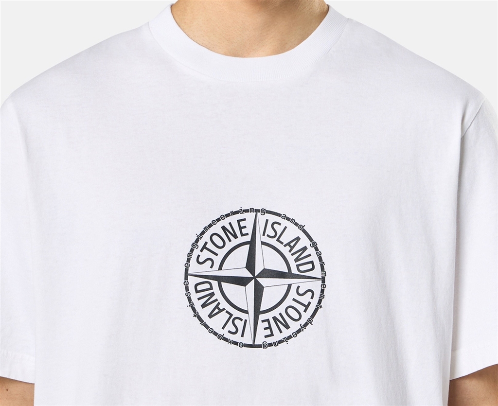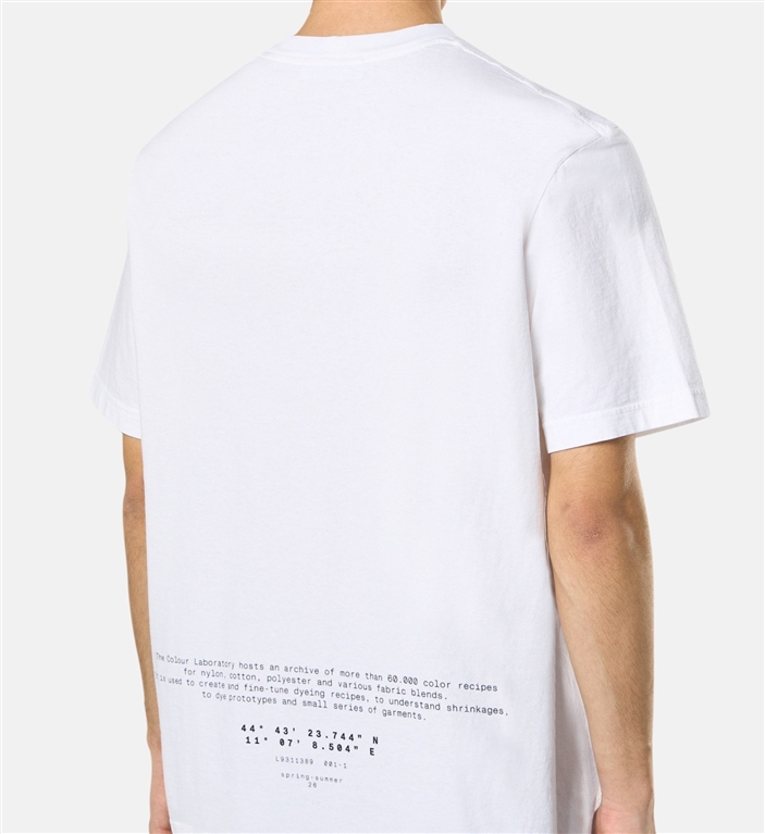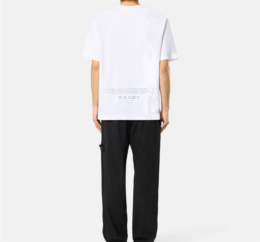 T-shirt a manica corta in jersey di cotone biologico con stampa logo Compass sul petto e scritta sul retro che richiama lo Stone Island Colour Laboratory. Modello tinto in capo.T-shirt a manica corta in jersey di cotone biologico con stampa All Around Compass. Modello tinto in capo.