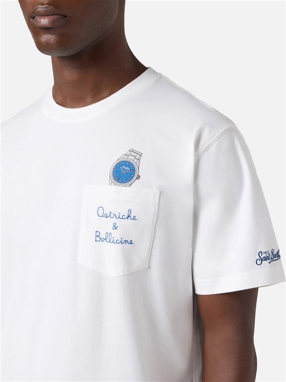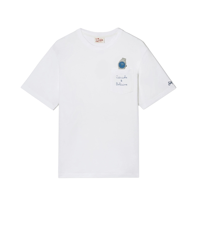 La t-shirt Austin è realizzata in puro cotone, progettata per offrire comfort e una sensazione naturale sulla pelle. Il design bianco tinta unita valorizza la costruzione essenziale del capo. Il modello presenta un taschino sul petto con ricamo a contrasto Ostriche e Bollicine ed è completato da unillustrazione di un orologio. Il capo è rifinito dal ricamo St. Barth. Il modello presenta scollo a girocollo, maniche corte e linea dritta con vestibilità regolare.Austin t-shirt