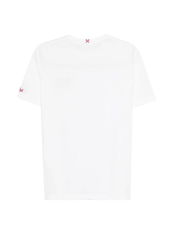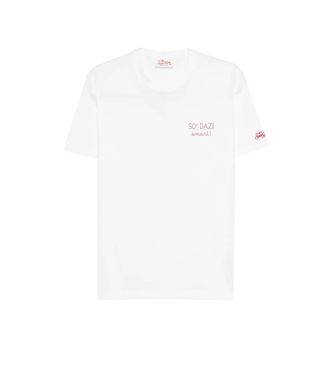 Portofino è la t-shirt da uomo con maniche corte realizzata in 100% jersey di cotone organico, tinto in capo per un look unico. Con un peso di 180 g, offre una vestibilità regolare e confortevole. T-shirt in cotone. Ricamo Dazi. Colore bianco. Tinto in capo. Girocollo. Maniche corte. Logo ricamato MC2 Saint Barth sulla manica sinistra.
