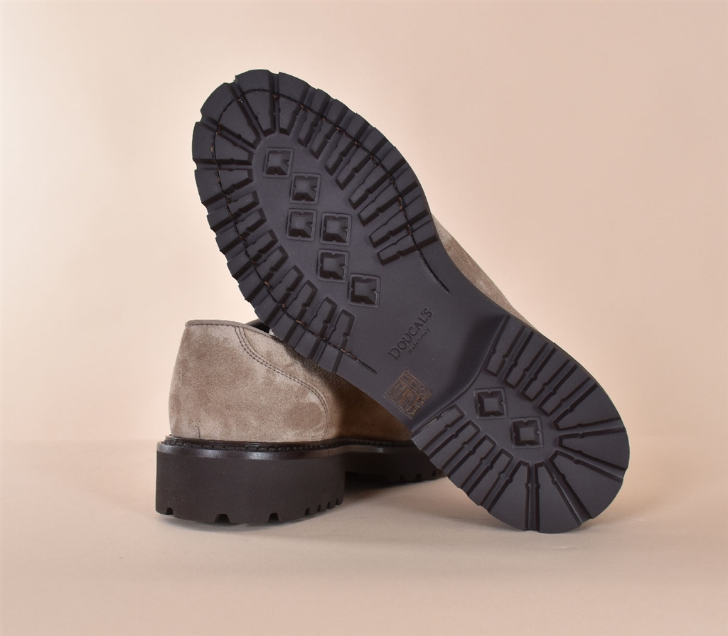 Paraboot style shoes in cocoa-colored suede, with knitted laces and metal loops. Suede lace-ups in cocoa shades, with contrasting laces and metal hooks for fastening. Ultra-light rubber sole. Blake stitching.