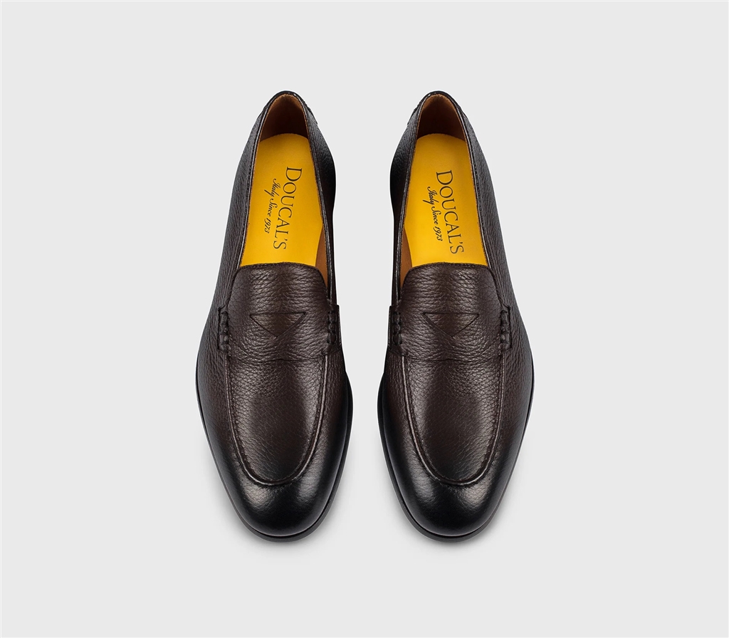Penny moccasin in soft deerskin, a high quality natural material with a unique pattern in dark brown. The tapered shape gives a modern elegance, while the pouch construction and the tray seam guarantee comfort and flexibility. The Blake manufacturing ensures a soft and resistant fit. The model is completed by the Golden Cream yellow leather sole with half rubber sole, designed for daily use. Made in Italy.