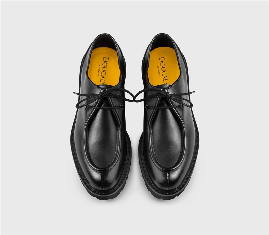 Two holes in Total Black leather holes, elegant design with modern lines with relief tray seaming. It is characterized by the Blake processing that makes the shoe resistant and soft in the fit. Ultra light rubber sole. Made in Italy.