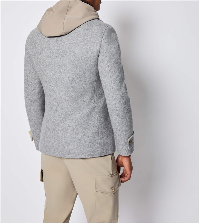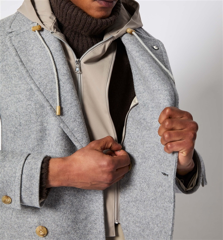 Peacot as a men in jersey in the delicate tones of light gray, designed to combine comfort and refinement. Equipped with removable hood and practical trench -style pockets, it is completed by a large rever and contrasting buttons in the warm honey tones, which give a distinctive touch to design. This timeless corporate is a real must-have for those who want practicality without sacrificing style.