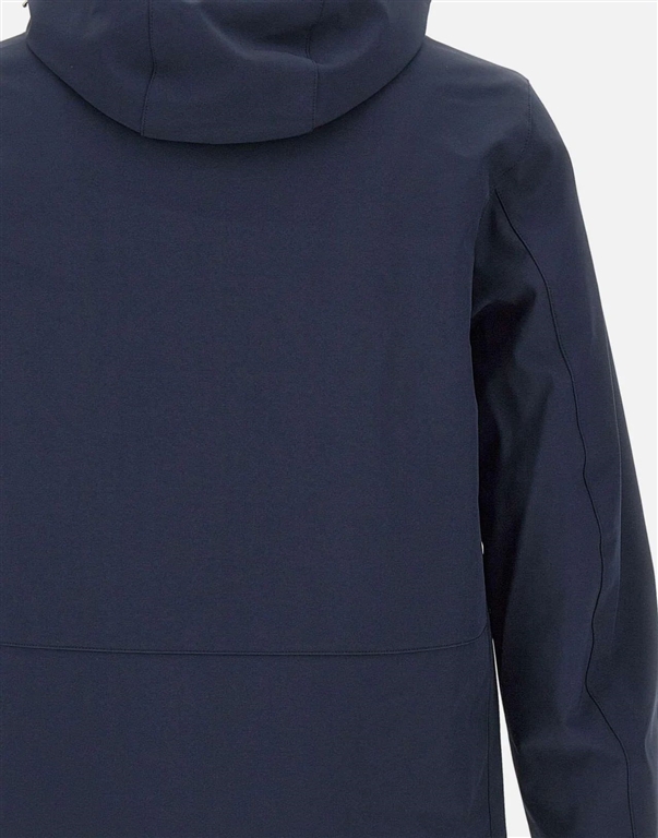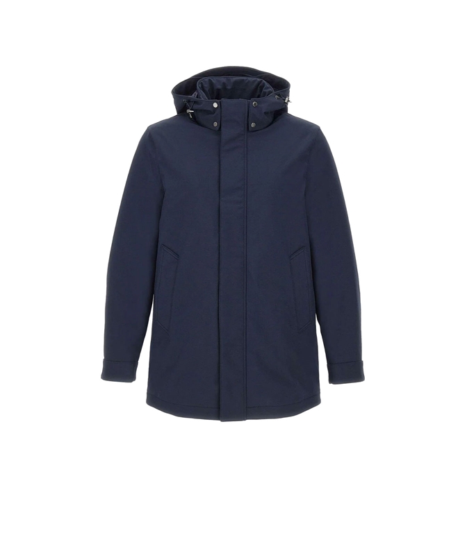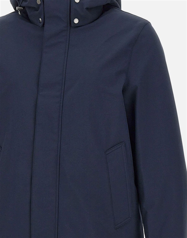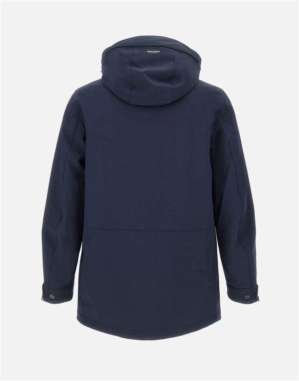 Woolrich "Soft Shell Barrow" jacket in blue technical soft shell fabric, water- and wind-resistant. It features a removable hood with a logo drawstring, heat-sealed trim, a double front zip and button closure, side pockets with buttons, and adjustable cuffs. Partially padded with down for lightweight warmth, ideal for transitional weather. Internal pocket with vertical zip. Thermal rating: light down 32°F / 0°C. Regular fit.