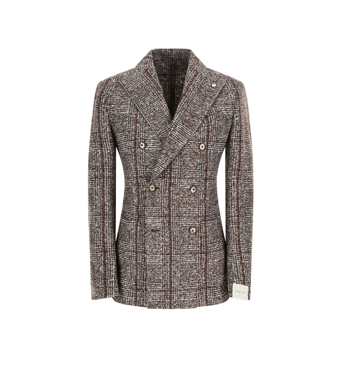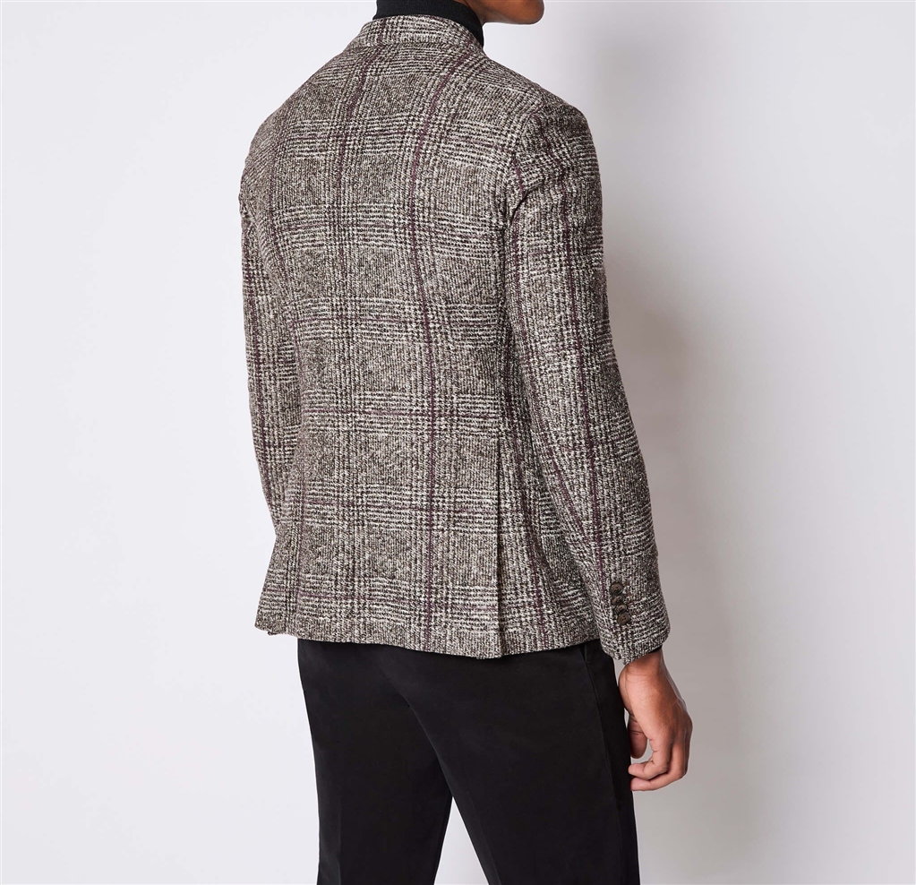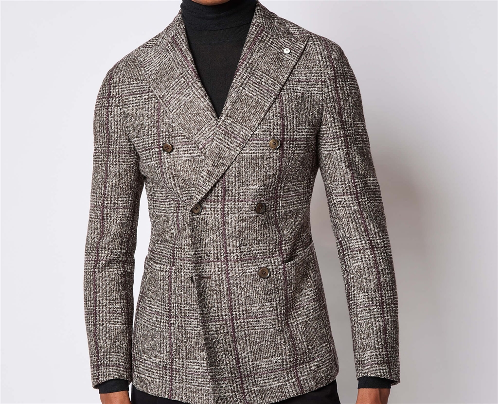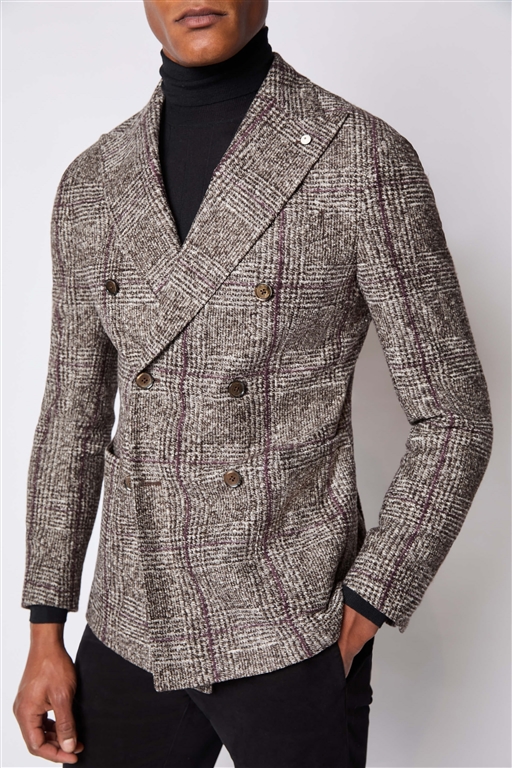 Men's double-breasted jacket featuring a refined Prince of Wales check pattern, where gray and brown alternate with subtle burgundy lines. The fit is slim and modern, designed to flatter the figure without sacrificing comfort. The wide peak lapel, six-button closure, and jersey fabric structure convey a sense of solid, well-defined elegance, perfect for the man seeking a distinctive style. Worn over a turtleneck, this jacket expresses an impeccable balance between sobriety and personality.