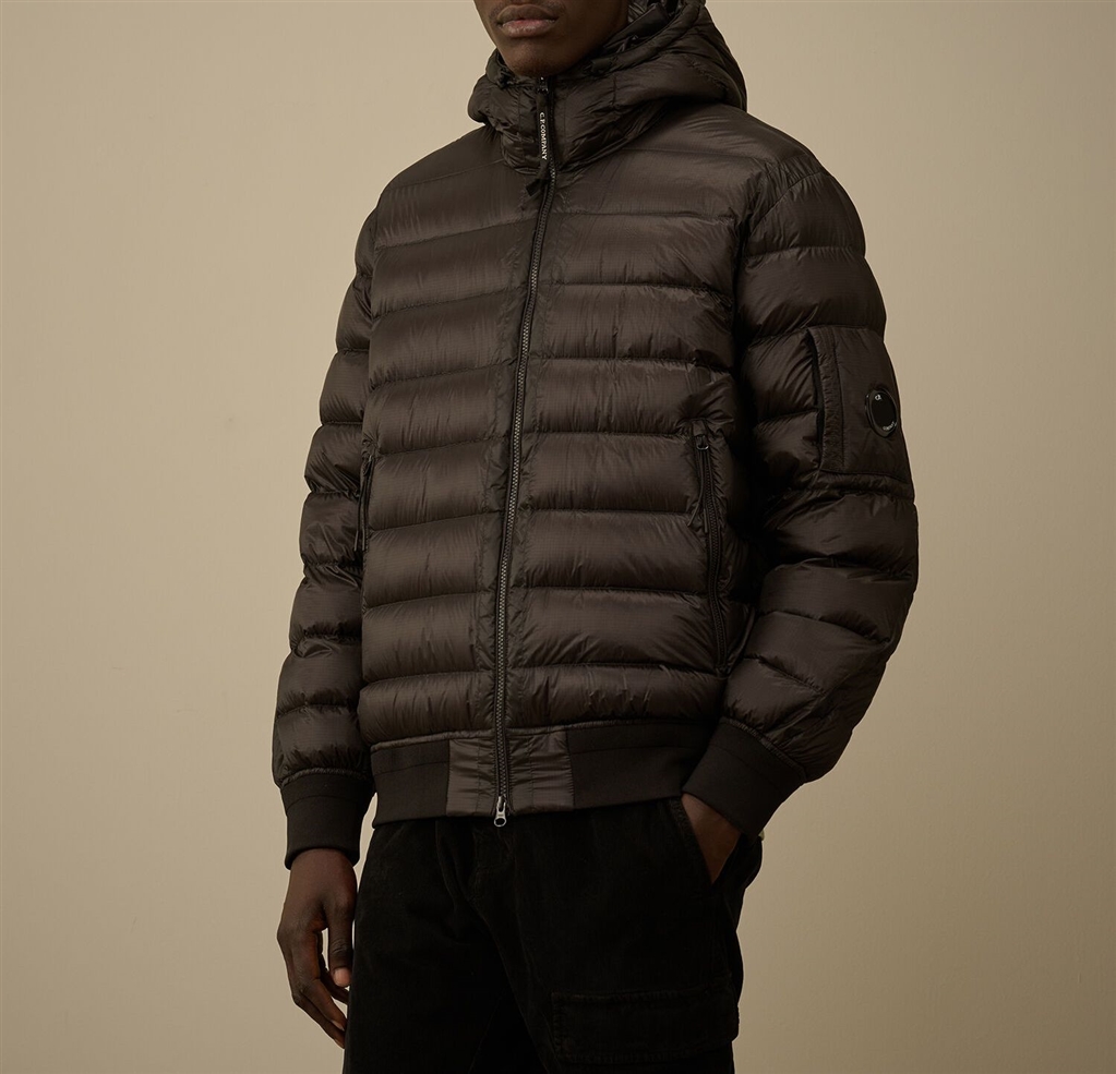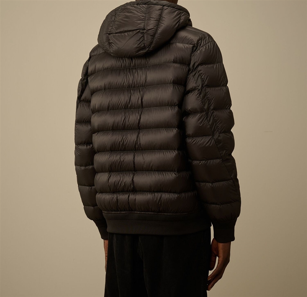 Duvet made in D.D. Shell, an opaque micro-ripstop nylon 7 denarii. The lightness and transparency of the material highlights the construction, while the direct feather injection process ensures ideal isolation. The garment has adjustable hood, full cursor full zip closure and zip side pockets. Finished with the iconic lens of C.P. Company, cuffs and ribbed hears. Regular fit.