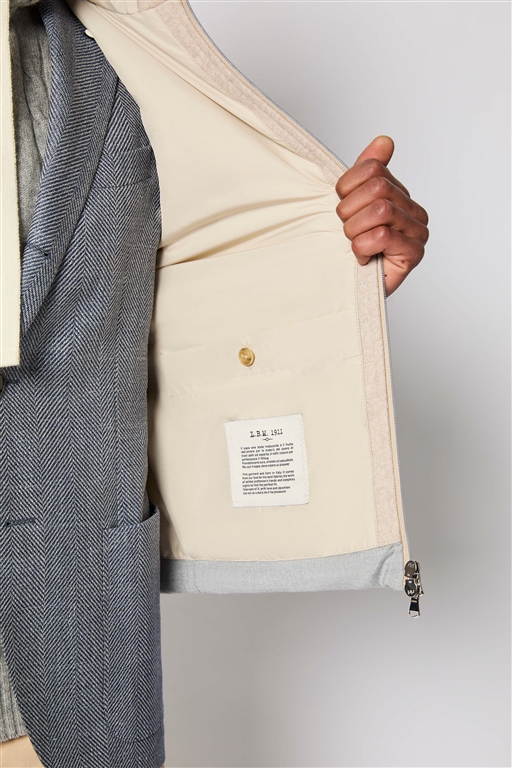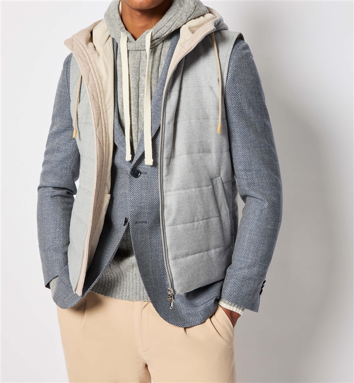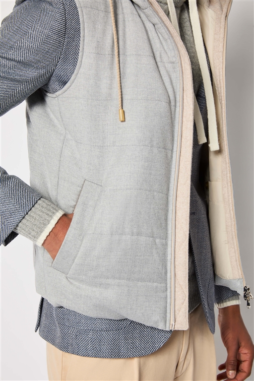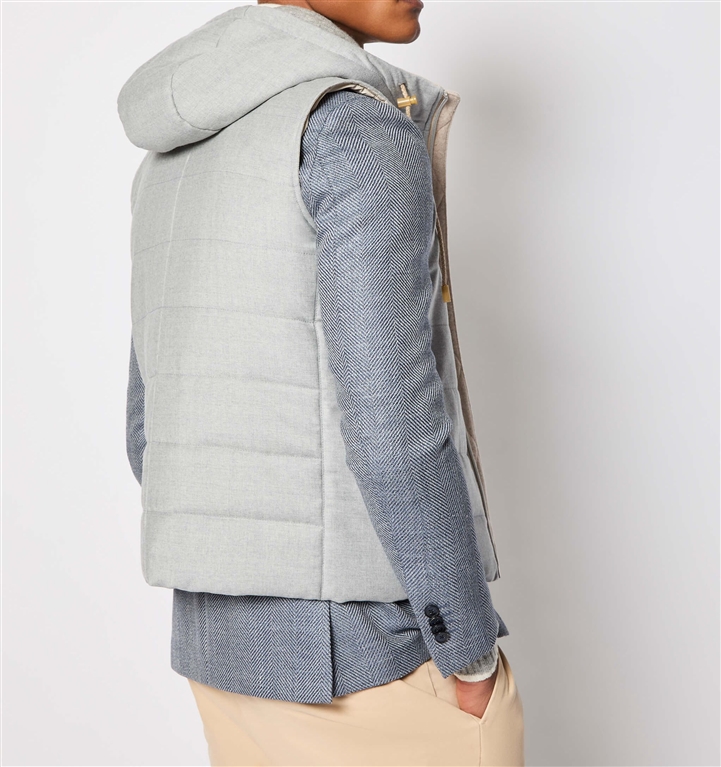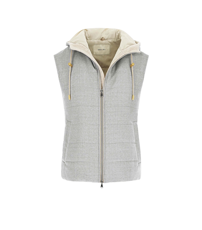 Padded men's vest in the cold tones of light gray melange with internal beige contrast coating. Equipable hood via drawstring. Pockets with zip closure. Front closure with bidirectional zip. The padding in synthetic fibers is light, the external fabric is made of 100% virgin wool. Ideal garment to wear in the mid-season.