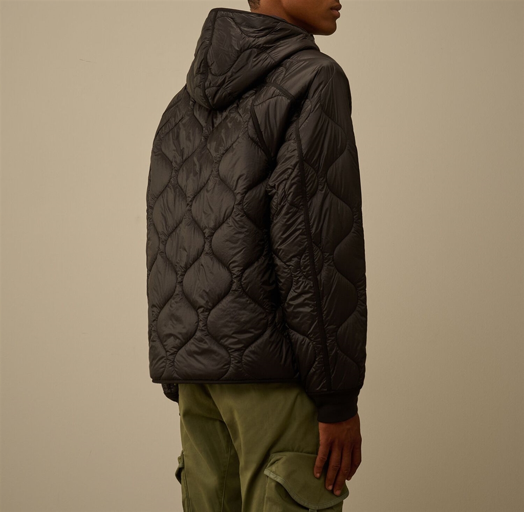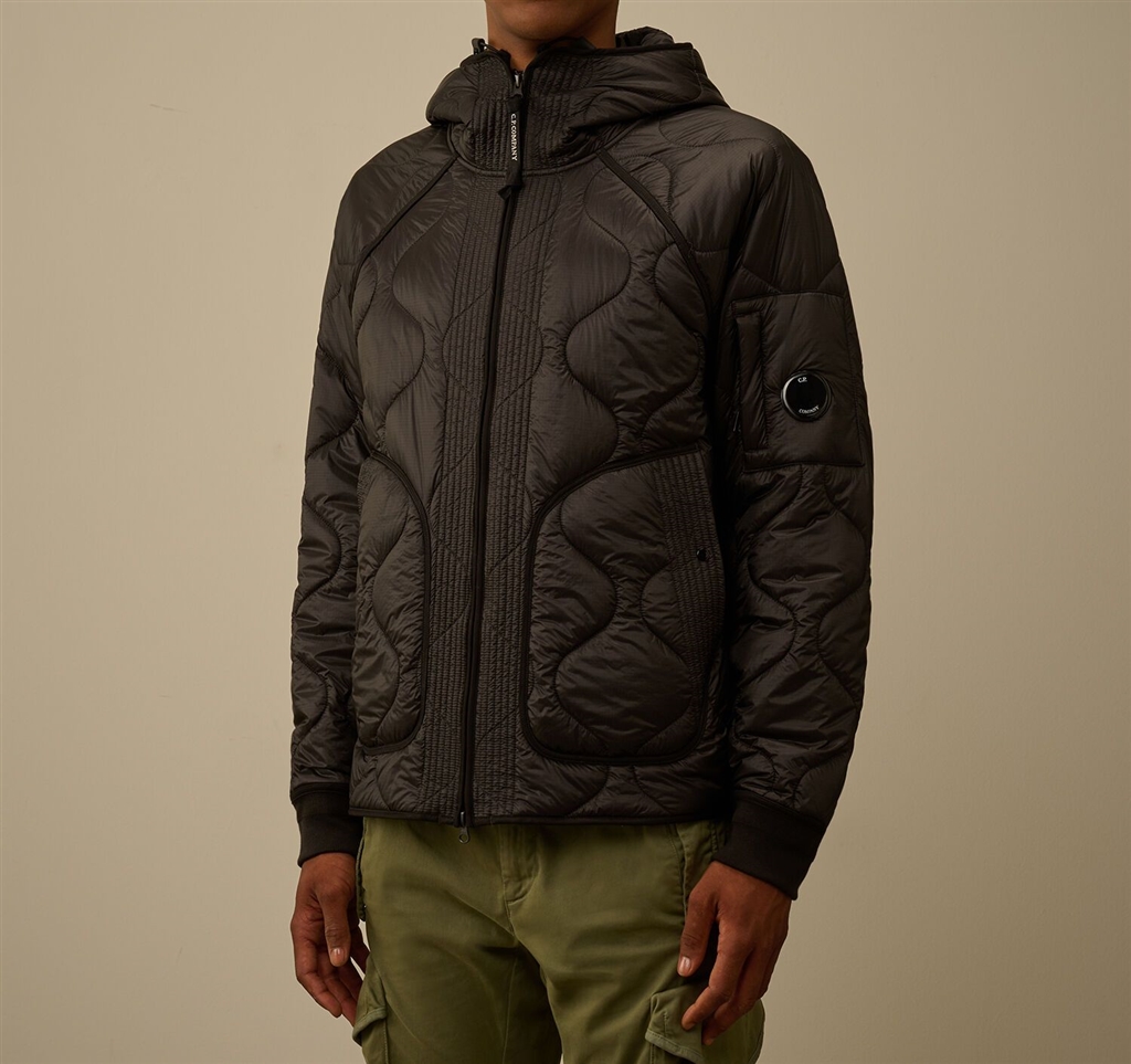 Padded jacket made of opaque micro-ripstop Nylon 3 denarii. The lightness and transparency of the fabric emphasize the structure of the head. The jacket presents the iconic lens of c.p. Company, a full cursor full zip closure, side pockets with a adjustable flap and hood. Padded with the Primaloft® Silver ovatte, an insulating solution with high thermal and breathable properties. Regular fit.