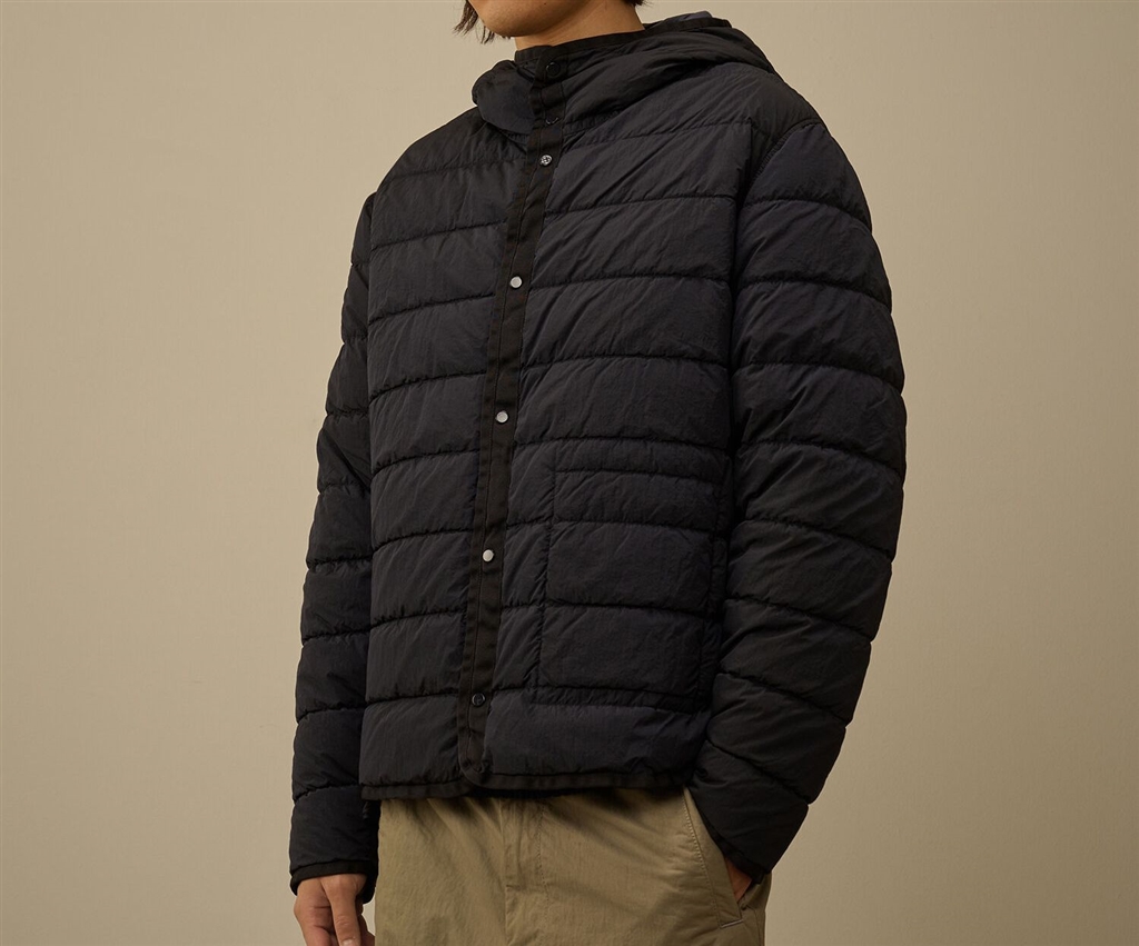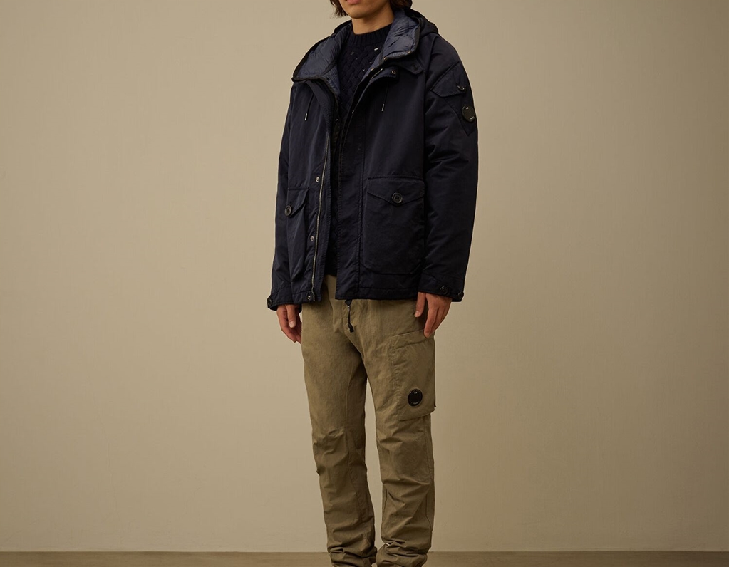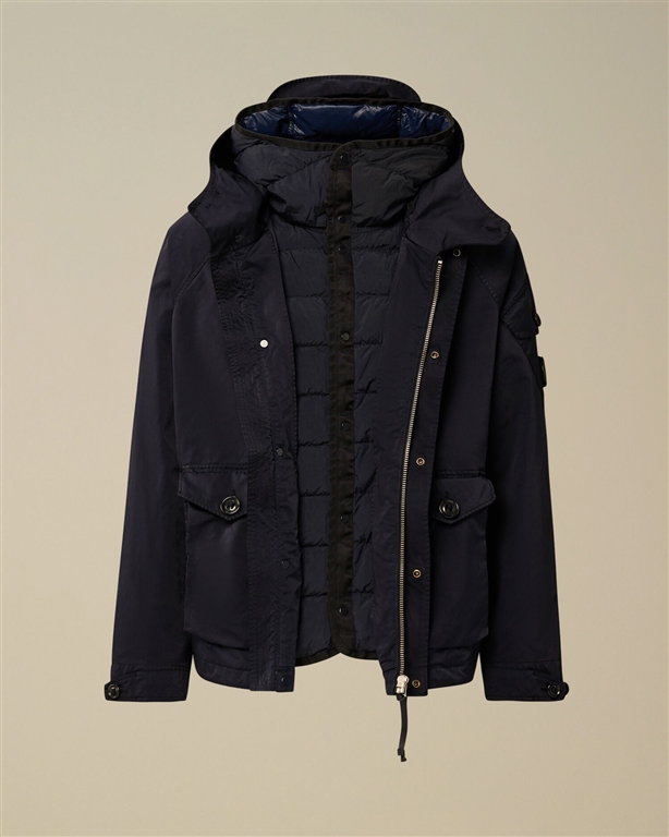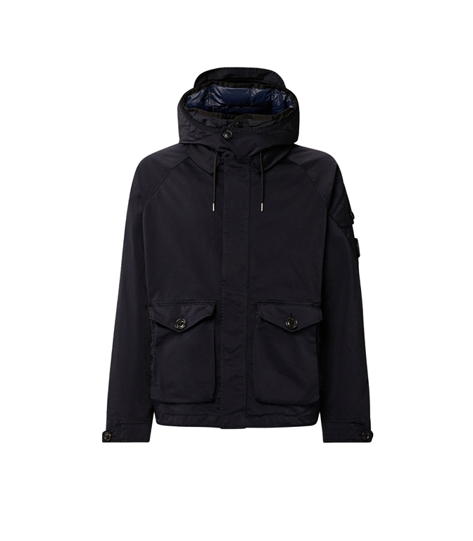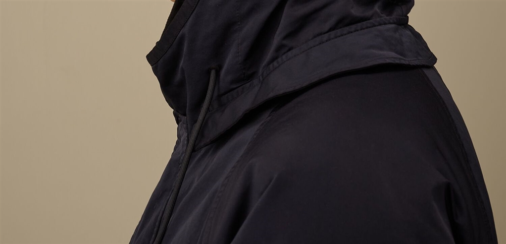 Hooded jacket made of Micro Kei, a soft and resistant polyester/nylon microfibre, designed to guarantee protection in all weather conditions. The garment features a hood with adjustable visor and face protection with buttons, hidden full zip closure with flap and snap buttons, front patch pockets with buttons and side opening with snap. Complete with a buttoned patch pocket on the sleeve with Lens, adjustable buttoned cuffs and a detachable inner down jacket with hood and press studs. Garment dyed with anti-drop treatment. Regular fit.