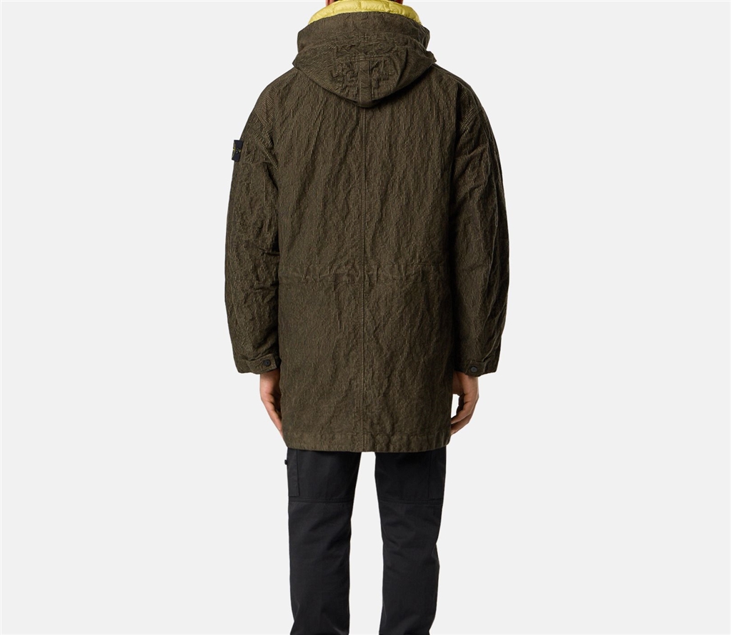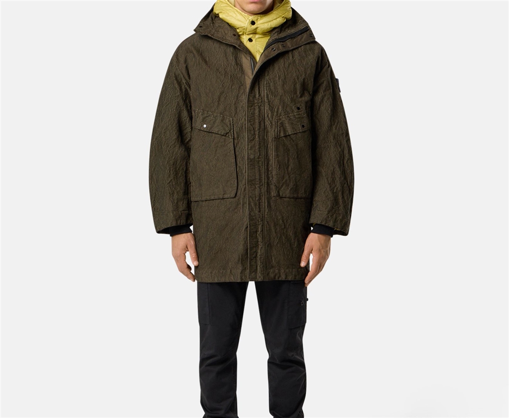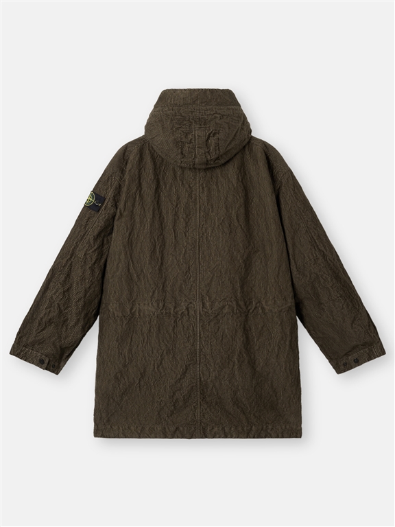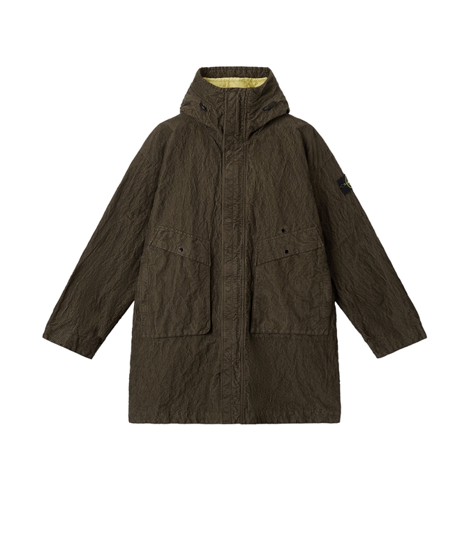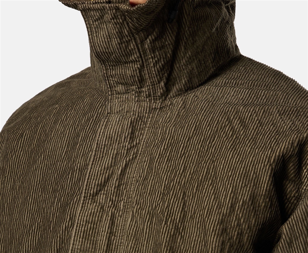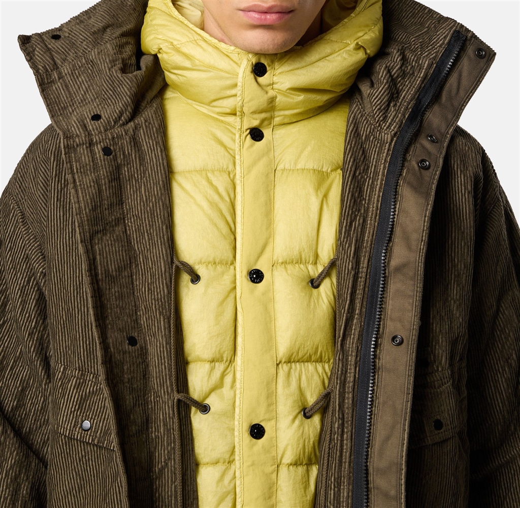Parka with hood in 500 cotton and nylon corduroy with an elastic feel and a wrinkled look, equipped with large bellows pockets and a removable down-padded lining. Garment dyed model with an anti-drop agent. Parka with hood in 500 cotton and nylon corduroy. The weft is made with monofilament nylon which gives the fabric an elastic feel and a wrinkled appearance. Garment dyed model with the addition of a special anti-drop agent. The removable lining is padded with the highest quality feathers, specifically treated to resist garment dyeing. Responsible Down Standard (RDS) certification.