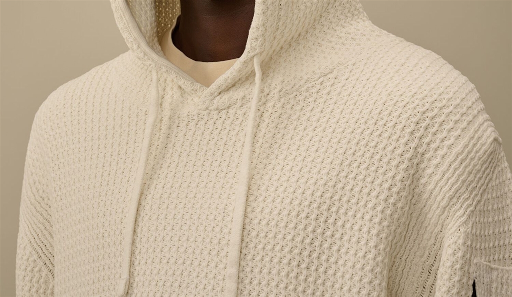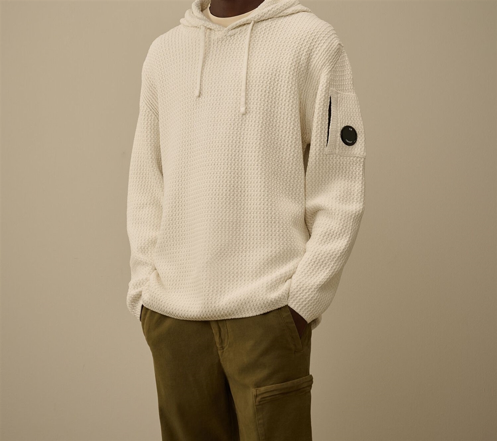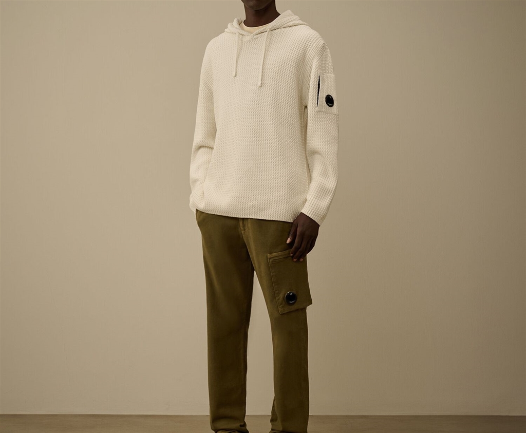 Hooding sweater made of cotton cynille. The model has adjustable hood and the iconic lens of c.p. Company. Dyed in the head. Fineness 5. Regular fit.