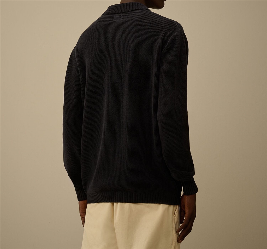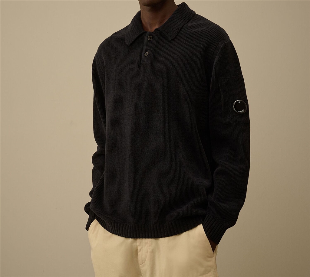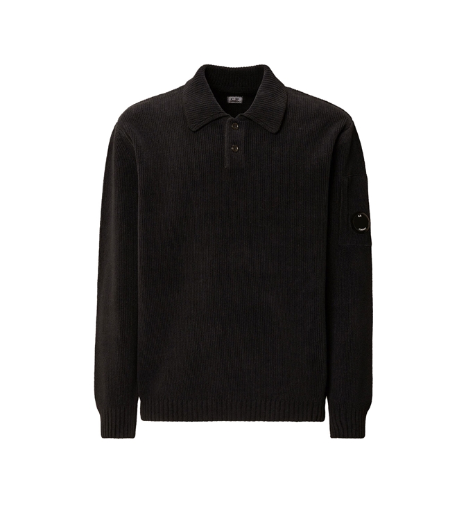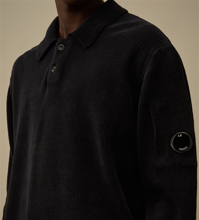 Polo sweater made of cotton cynille. The model has a classic collar with two buttons, the iconic lens of c.p. Company, cuffs and ribbed bottom. Dyed in the head. Fineness 7. Regular fit.