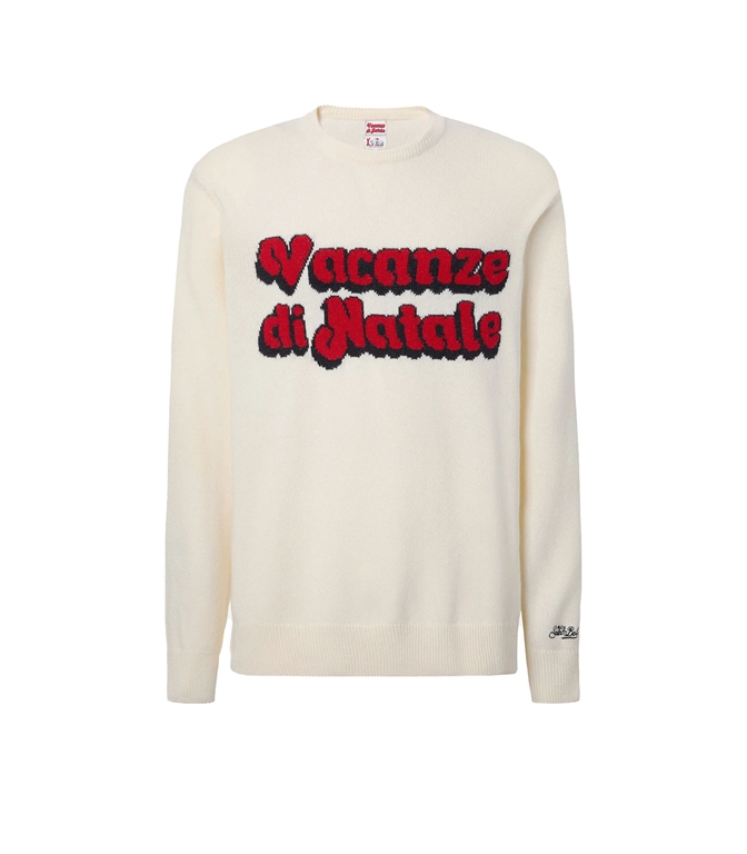 White Heron with Vacanze di Natale jacquard immediately brings a festive mood to everyday life. To be worn easily with denim or more elegant with tailored trousers during the holidays. Stocking stitch sweater fn. 7Cashmere blend CrewneckLong sleevesRibbed bottom and cuffsRegular fitSt. Barth wrist embroideryChristmas Holiday jacquard graphicsSolid white color40% wool, 10% cashmere, 30% viscose, 20% polyamide
