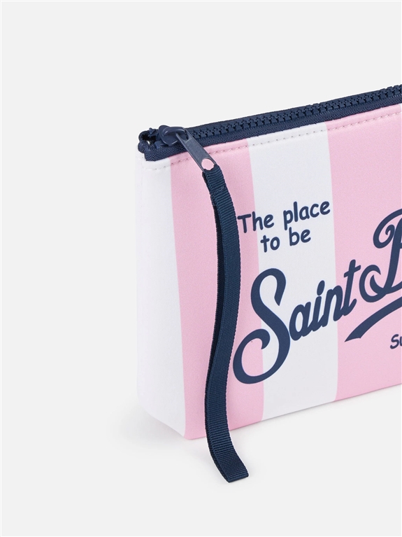 Our versatile aline case is not only perfect for keeping your accessories organized inside the bag, but it is also an elegant independent option, thanks to its practical tongue. It offers a wide range of colors and fabrics, from Scuba and Sponge to linen, lurex and cinille with rhinestones. Porta Mc2 Saint Barth with you, always. Clutch bag with pink striped Scuba fabric hinge on the whole surface Practice of Logo Logo Printed Exclusive Main Composition: Embrarmo chloroprene Dimensions: 20 x 14.5 x 7 cm