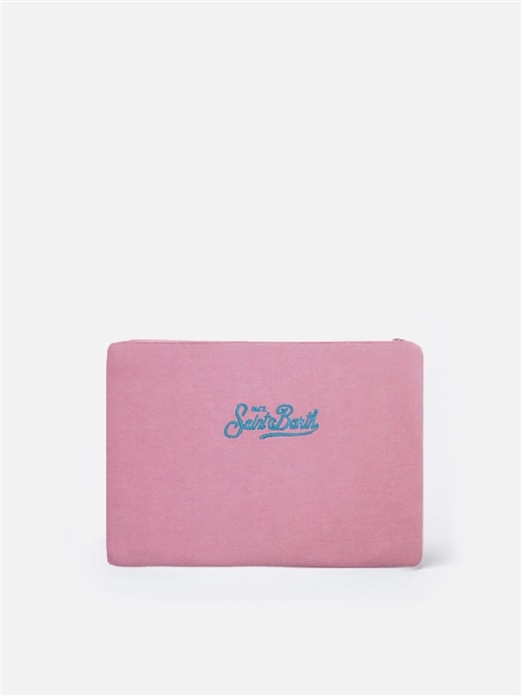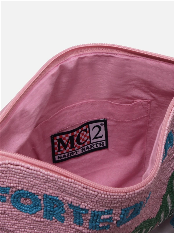 We present our Pouch Pearl, a fascinating accessory adorned with intricate beads depicting iconic maritime destinations all over the world. Made with meticulous attention to detail, this case has a cotton lined interior for longer duration and comfort. The zip closure is accentuated by a cotton nappa for easy opening and closing. Inside you will find a comfortable pocket to organize your essential objects. The rear is adorned with the Mc2 Saint Barth logo embroidered on cotton fabric. Case with beads model Strong postcard model of the marble closure with cotton in cotton Exclusive embroidery logo Saint Barth Internal pocket lined in cotton dimensions: 20 x 28 cm.