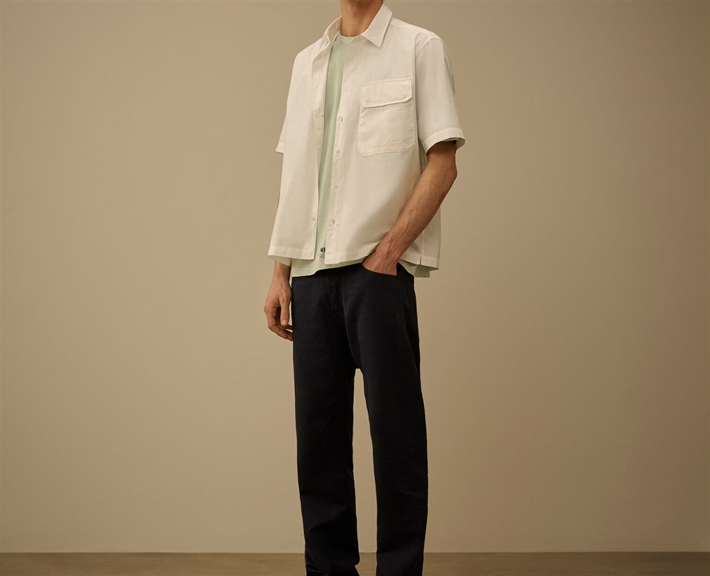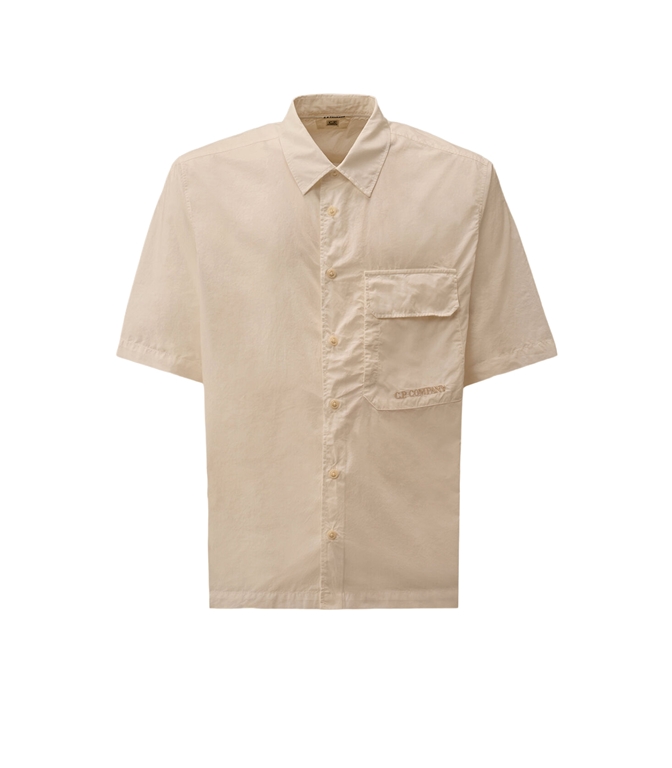 Short-sleeved shirt made of cotton poplin, a lightweight fabric with a shiny, compact and soft feel. The model features a classic collar, a front button closure and a chest pocket with flap, snap button and embroidered logo. The design is completed with side slits. The shirt is garment dyed to obtain unique color intensities that enhance with time and use. Made in Italy. Regular fit.