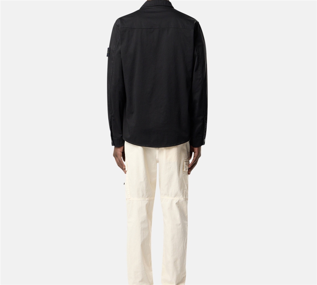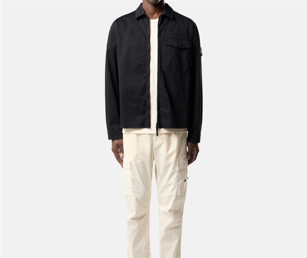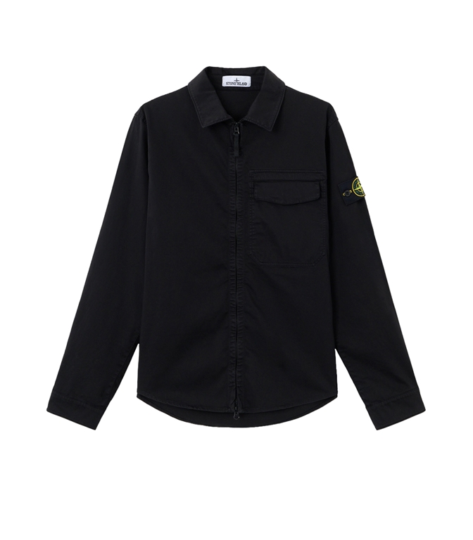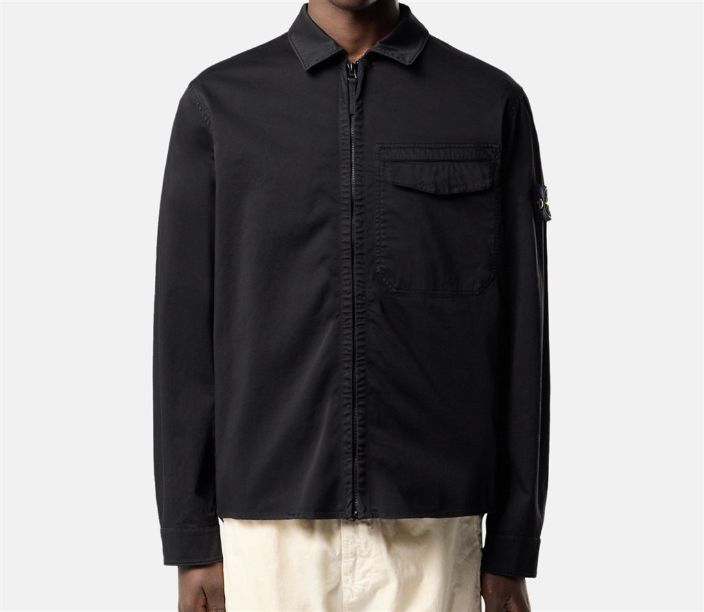 Stretch organic cotton satin overshirt with buttoned chest pocket, snap button cuffs and hidden two-way zip closure. Garment-dyed model. Stretch organic cotton satin overshirt. Garment dyed model.