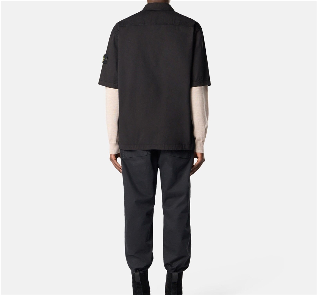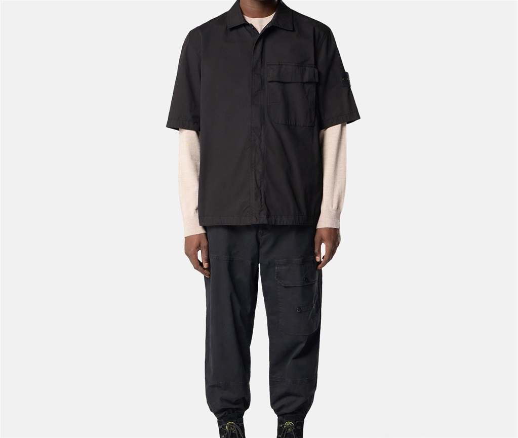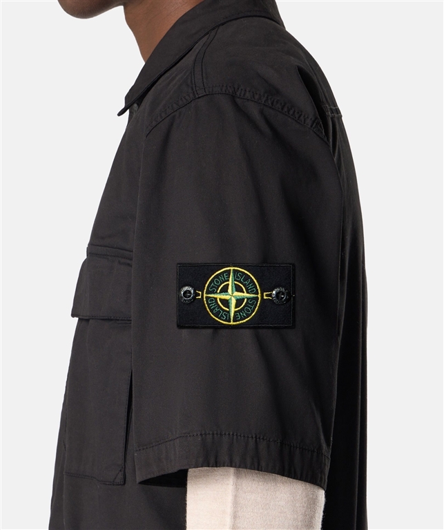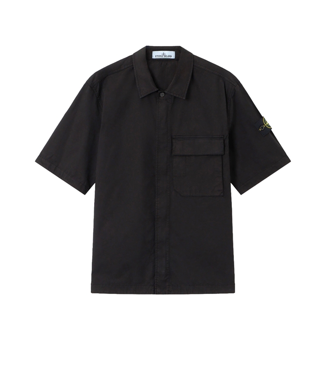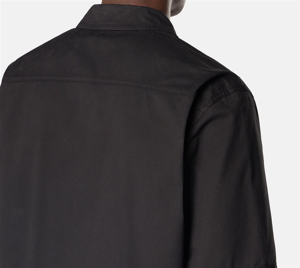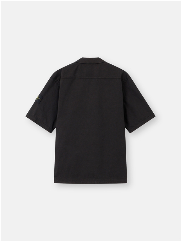 Short-sleeved shirt in stretch organic cotton twill, with double compartment chest pocket and two-way zip closure. Garment-dyed model. Short-sleeved shirt in stretch organic cotton twill. Garment dyed model.