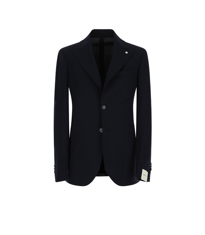 Men's single-breasted, two-button suit crafted from a sophisticated fabric with a textured finish, featuring a refined shade of blue that lends depth and a simple yet contemporary elegance. The design is defined by wide peak lapels, roomy patch pockets at the sides, and a boat pocket at the chest, all elements that highlight its craftsmanship. The slightly unstructured construction and lack of lining offer superior comfort and a natural fit, making it ideal for a refined, yet lightweight, smart-casual look, perfect for transitional seasons. Careful details, such as the pin on the lapel and the open buttonholes at the cuffs, demonstrate the finest tailoring.