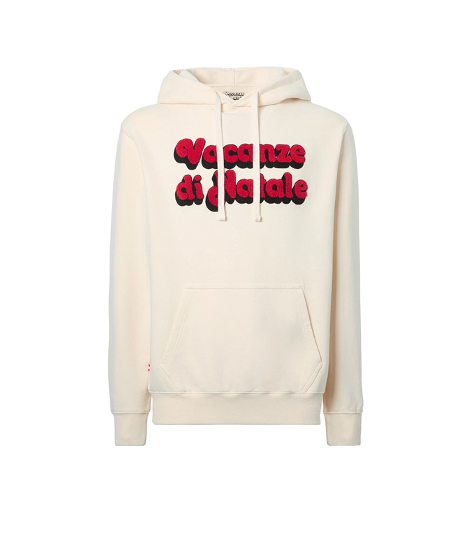 Cream white, sponge embroidery and author's reference: Tribeca celebrates the Vanzina cult film with minimal elegance. Sweatshirt with hood and kangaroo pocket Cotton sweatshirt with brushed interior Cream white With hood Kangaroo pocket Matching rib Central sponge embroidery Christmas holidays Regular fit Composition: 100% cotton