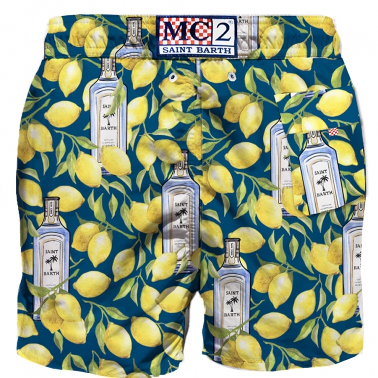 Beach bermuda, medium length, multicolored print with gin and lemon bottles, blue bottom, regular fit, ergonomic internal briefs, drawstring closure, back pocket with velcro.