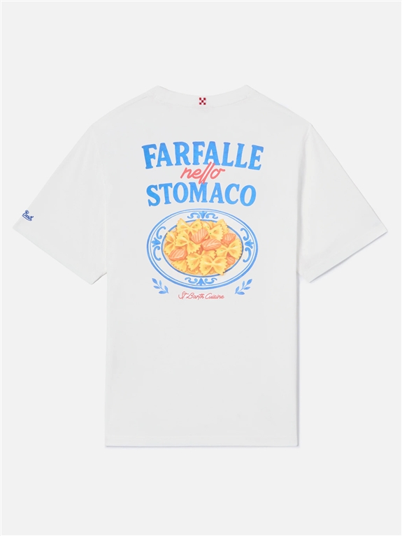 The Portland T-Shirt is made from pure cotton, designed for comfort and a natural feel against the skin. The solid white design enhances the essential construction of the garment. The model features a Farfalle Nello Stomaco print on the chest, while on the back it is enriched by a maxi graphic illustration with a plate of farfalle pasta and decorative lettering. The garment is finished with logo embroidery on the sleeve, crew neck, short sleeves and a straight fit with a regular fit. Portland T-shirt